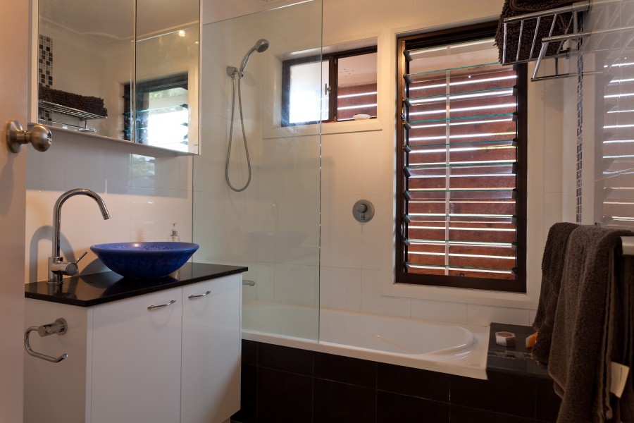 The timber hallway off the kitchen also enjoys views out to the pool, and the home's two bedrooms and renovated bathroom are both located off here. The bathroom has modern styling and a vibrant sapphire blue freestanding bowl as the sink.