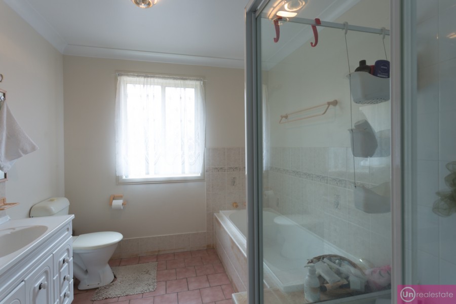 It features three bedrooms, two of which have built in robes and are located on the entry level of the home. The main bedroom has direct access to the large bathroom with shower, vanity, toilet and full size bathtub. There is also the bonus of an extra toilet in the laundry on this level, which has access to the low maintenance back yard.