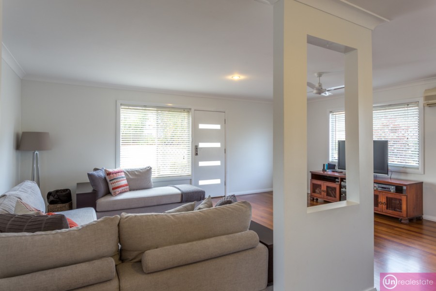 The practical layout features the living areas at the front of the home with beautiful timber floors throughout the lounge dining area which has a reverse cycle air conditioner and ceiling fan.