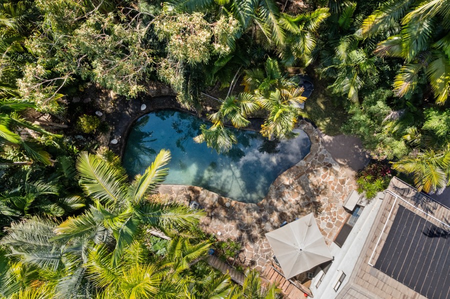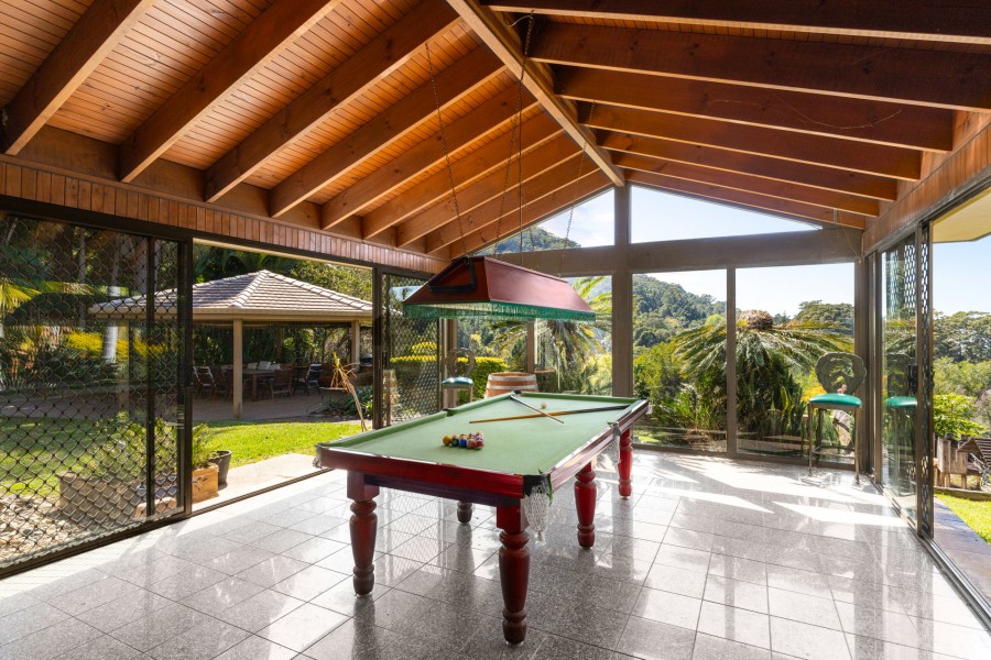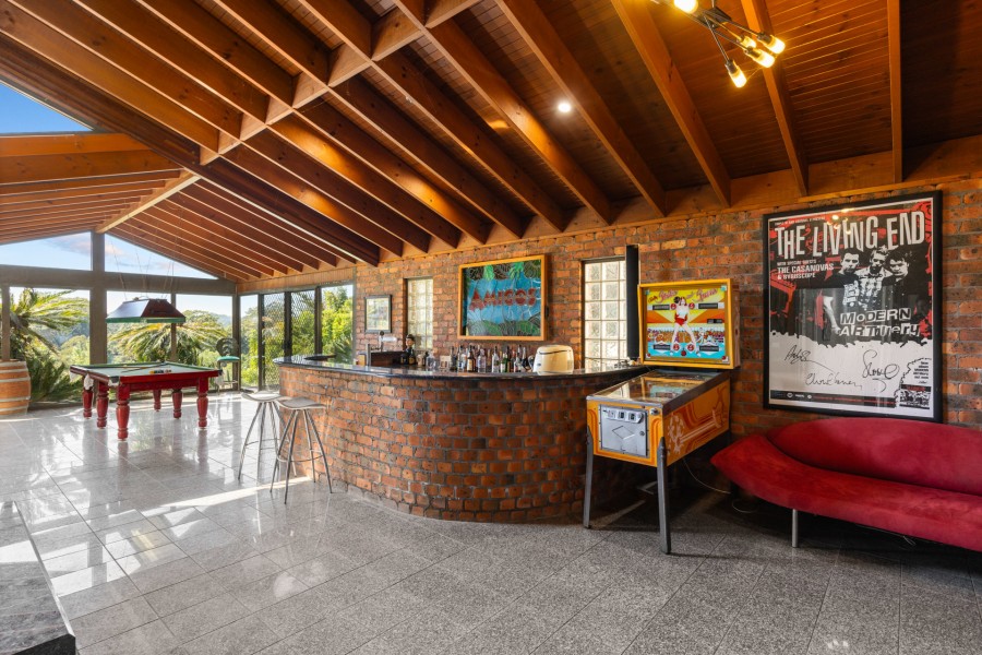 Extending from this area is the 'Ultimate Mancave'-a spacious room featuring a central bar with granite benchtops, a beer tap, and built-in under-bench glass door refrigerators. At one end, there's a slate pool table, accompanied by large windows that invite the serene valley views inside.