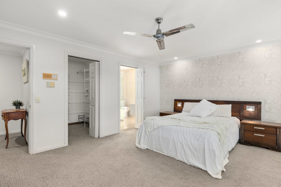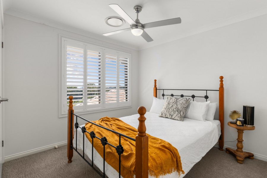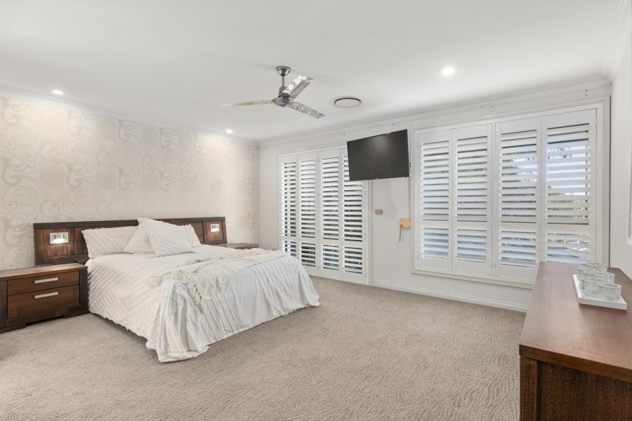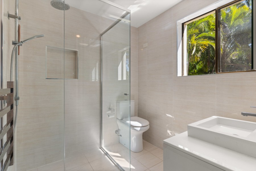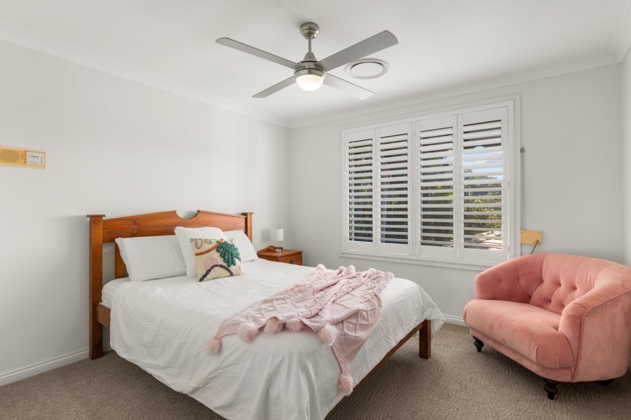 Ascending to the bedroom level, you will find the master suite-an expansive bedroom featuring a walk-in robe and a modern ensuite. This room is enhanced with contemporary plantation shutters, a ceiling fan, and is serviced by ducted air conditioning, as are all the bedrooms. The three additional bedrooms come equipped with large built-in robes, ceiling fans, and plantation shutters, all comfortably accommodating queen-sized beds. This level also includes a beautifully renovated bathroom, complete with a spacious shower and a freestanding bathtub, ideal for unwinding after a long day. A separate toilet adds convenience, making it a great asset for families.