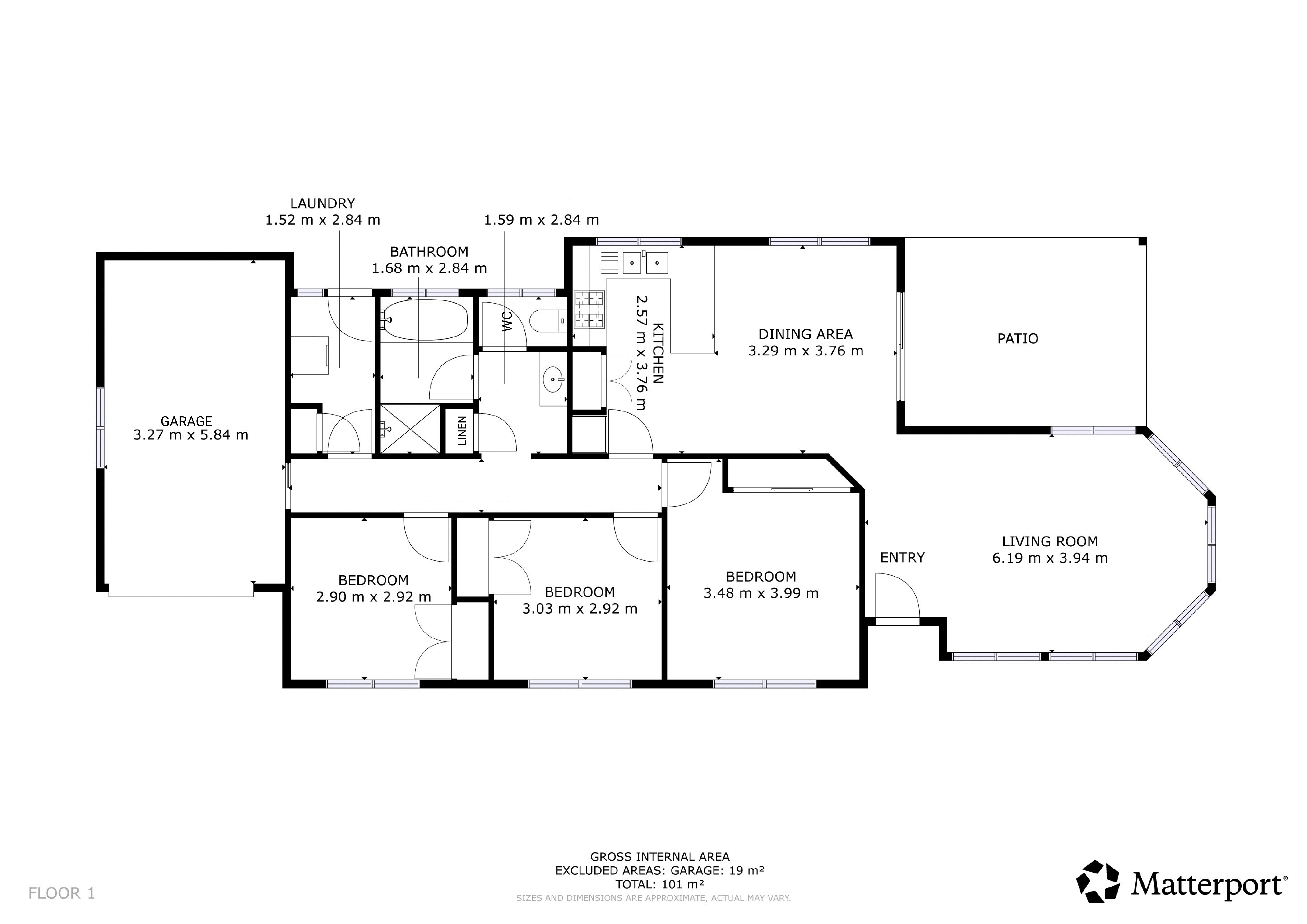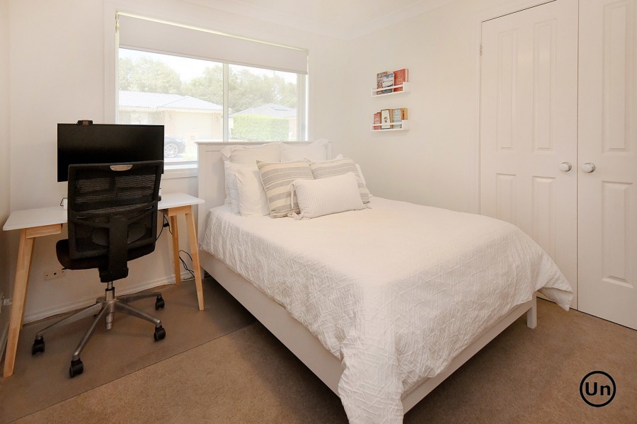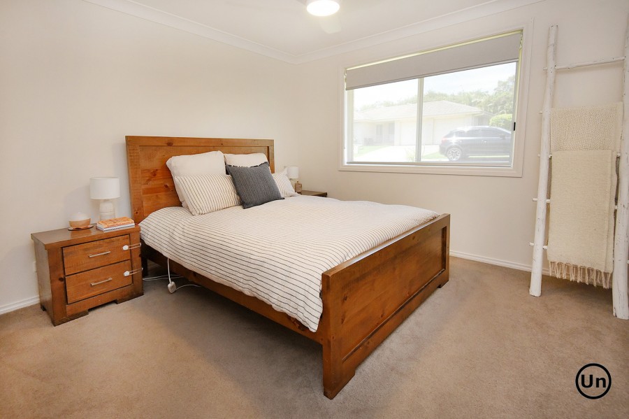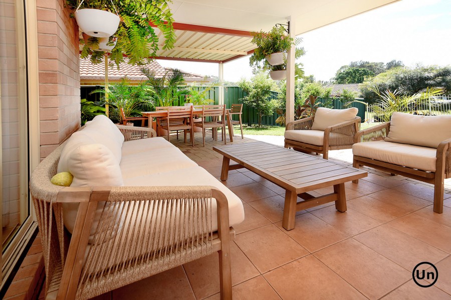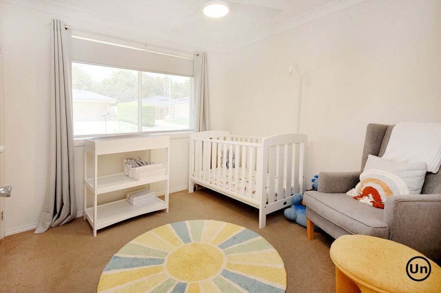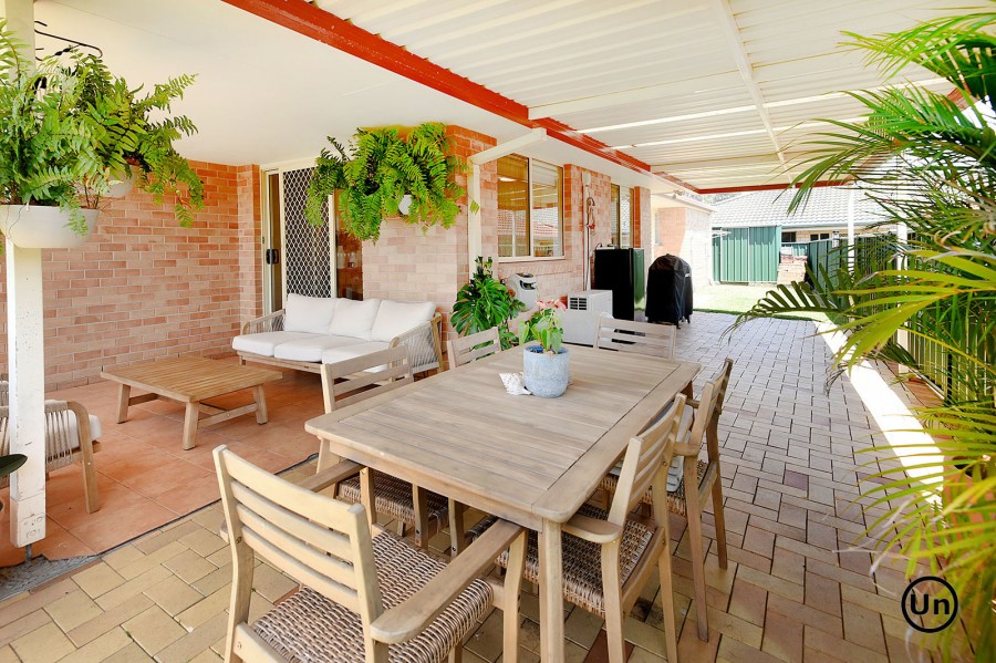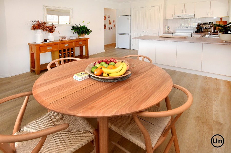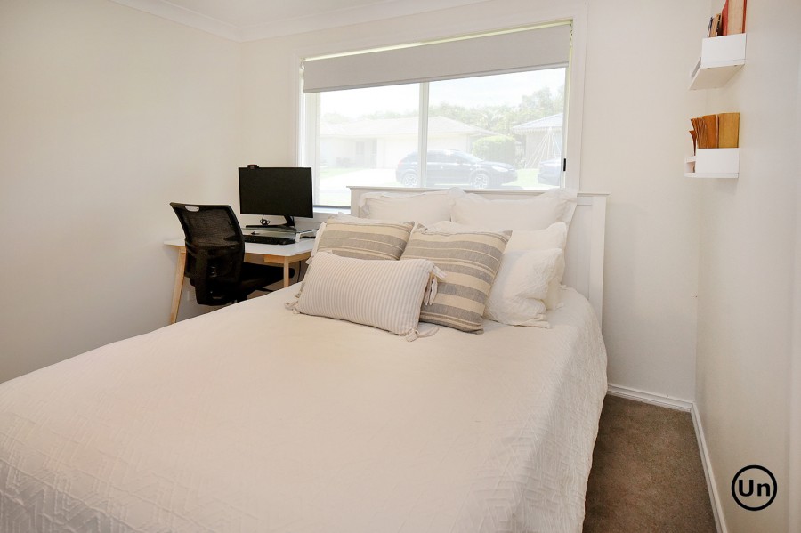 The functional kitchen is equipped with an all-in-one electric cooktop and oven, a double-door pantry, double sink, and a generous laminate benchtop. This space seamlessly overlooks the dining area, which features low-maintenance timber-look vinyl flooring for both style and durability. Entertaining is a breeze as the dining area flows effortlessly through sliding doors to a large, covered outdoor entertaining space and a lush backyard.