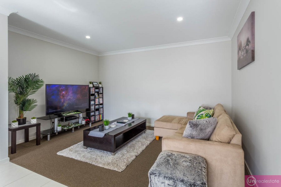 One of the great features of this modern home is the sense of flow with the floor plan. A tiled and spacious formal dining zone enjoys ample sunlight, while a carpeted living room or media zone is opposite on the other side of the central hallway.