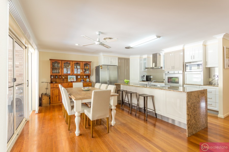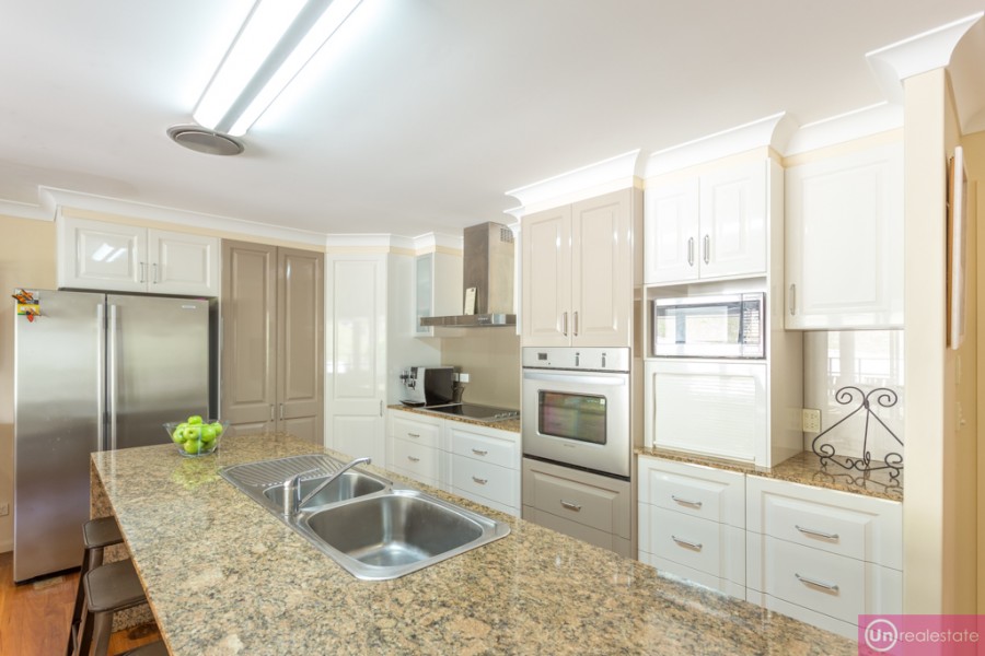 But it's the kitchen area which really puts this property in a league of its own, with two-pac doors and drawer fronts, generous cupboard/pantry storage, utility cupboard, gold granite waterfall island bench, glass splashbacks, and stainless steel quality appliances. The wall oven is among the largest we've seen and the two-drawer Fisher & Paykel dishwasher is perfect for family living.