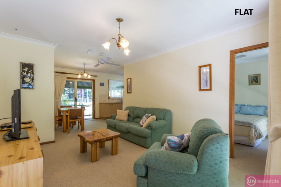 The 1 bedroom residence is air conditioned with well equipped kitchen open planned to the dining and lounge area and the spacious bedroom with ensuite and built in robes. With the sliding glass door just off the kitchen area leading out to the covered veranda, the perfect place to relax and enjoy the koi & goldfish pond and lush gardens.