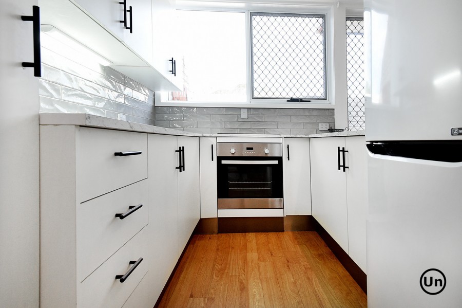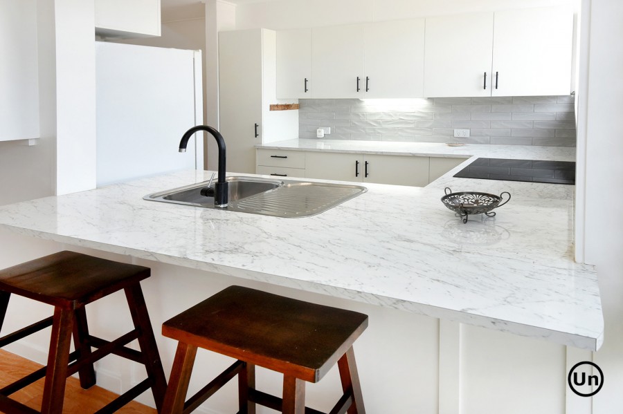 Walk through the front door and into the open plan living and dining area with adjacent kitchen. The white kitchen with stylish grey tiled splashback features plenty of cabinetry, plus ample bench space with overhang for stools, pantry, electric cooktop and oven.