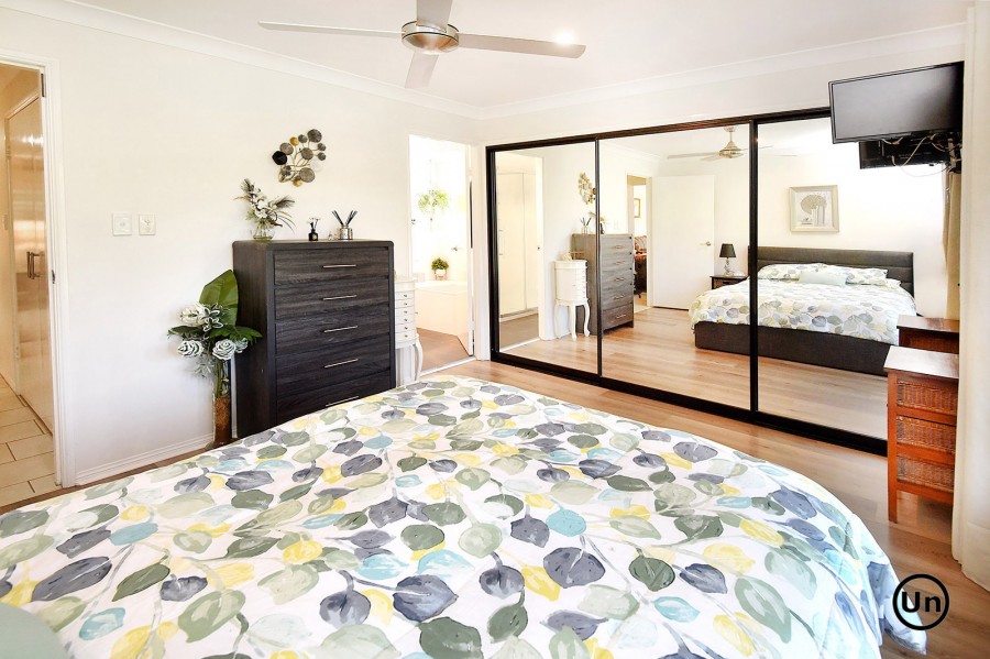 The main bedroom is positioned at the front of the home, taking full advantage of the lush outlook and cooling breezes, and is appointed with a three-door mirrored robe, ceiling fan, and a generous ensuite with a spa bath, separate shower, vanity, and toilet.